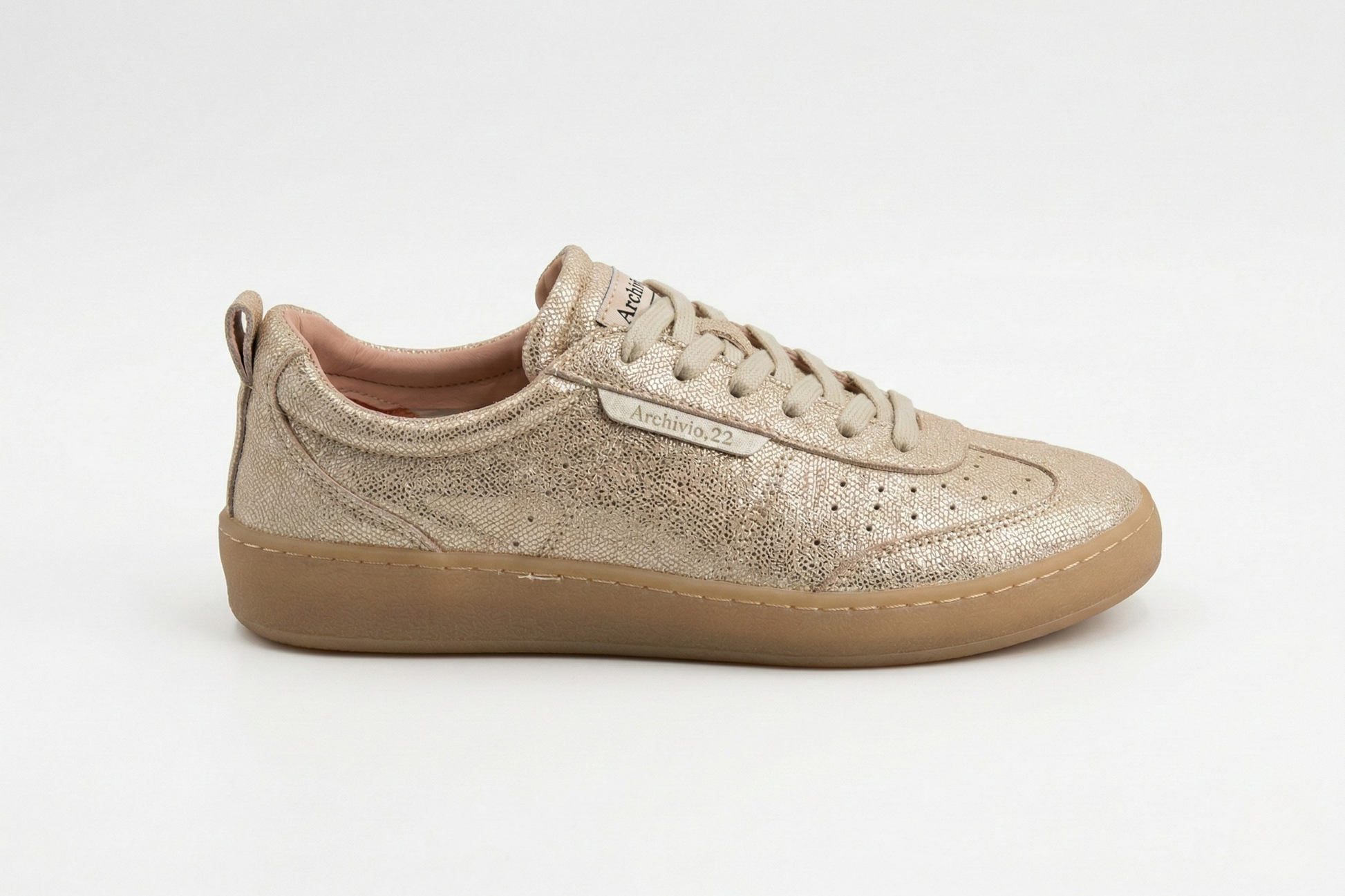 Tomaia in nappa con stampa laminata.